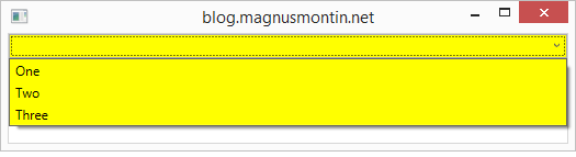 Posted: April 30, 2014 Filed under: WPF, XAML | Tags: Visual Studio, WPF, XAML 7 CommentsThis post explains how to change the colours of a ComboBox in a WPF application by overriding the control’s default template in XAML using Visual Studio 2012 or 2013.
