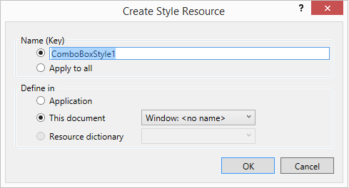 On Windows 8, this solution doesn’t work. This is because the default template for the ComboBox control differs between the different versions of Windows. To be able to change the background colour of a ComboBox in a WPF application running on Windows 8, you have to modify its default control template. To do this, you can right-click on the ComboBox element in design mode in Visual Studio 2012 or 2013 and select the “Edit template” option and then the “Edit a copy…” option. This will bring up a dialog that lets you specify the name and location of a style resource that is created for you when you click the “OK” button in the dialog: