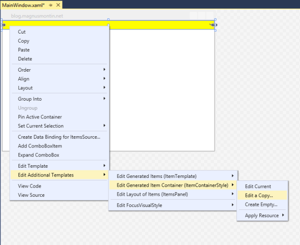If you want to change the colour that appears when the mouse pointer is located over a ComboBoxItem you will have to change its default template in the same way that you change the default template for the ComboBox itself. Right click on the ComboBox element in the design view in Visual Studio again and then select the “Edit Additional Templates” option followed by the “Edit Generated Item Container (ItemContainerStyle)” and “Edit a copy…” options.