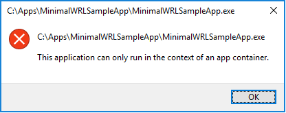 If you omit the /APPCONTAINER option when you compile, the app would crash at runtime. All apps that use any of the types that are defined in the Windows.UI.Xaml namespace must run in the context of an app container, and the app will run if you use the Add-AppxPackage cmdlet in Powershell to install it to your user account as part of signed app package: