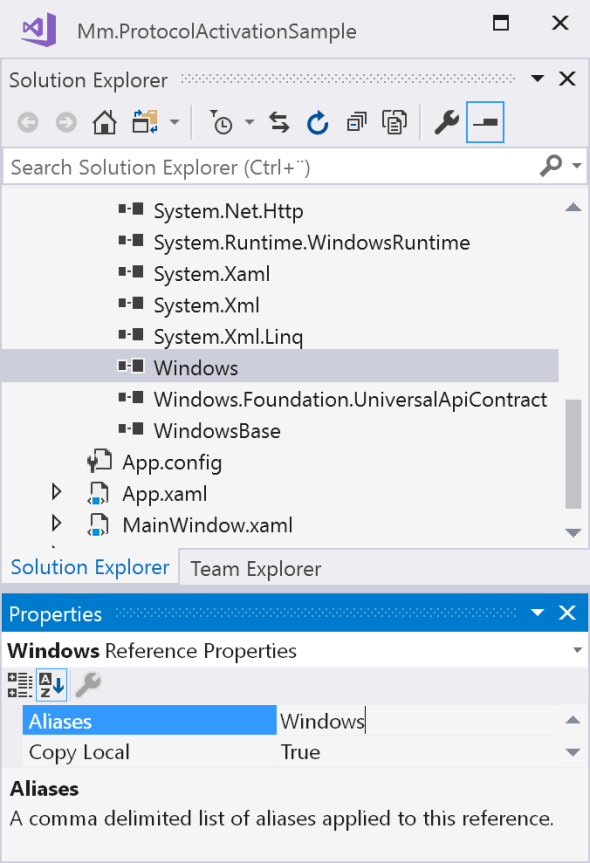 You need to add a reference to C:\Program Files (x86)\Windows Kits\10\References\10.0.17763.0\Windows.Foundation.UniversalApiContract\7.0.0.0\Windows.Foundation.UniversalApiContract.winmd from the WPF application to be able to call GetActivatedEventArgs(). If you have also added a reference to Windows.winmd and Visual Studio complains that “IActivatedEventArgs exists in both ‘Windows.Foundation.UniversalApiContract‘ and ‘Windows‘”, you can change the alias of the Windows.winmd reference to something else than “global”: