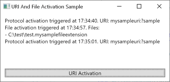 You can click on the “URI Activation” button to call the LaunchUriAsync method and activate the app using an URI, or you can create a “test.mysamplefileextension” file somewhere on your hard drive and double-click on it to try out the file activation functionality.